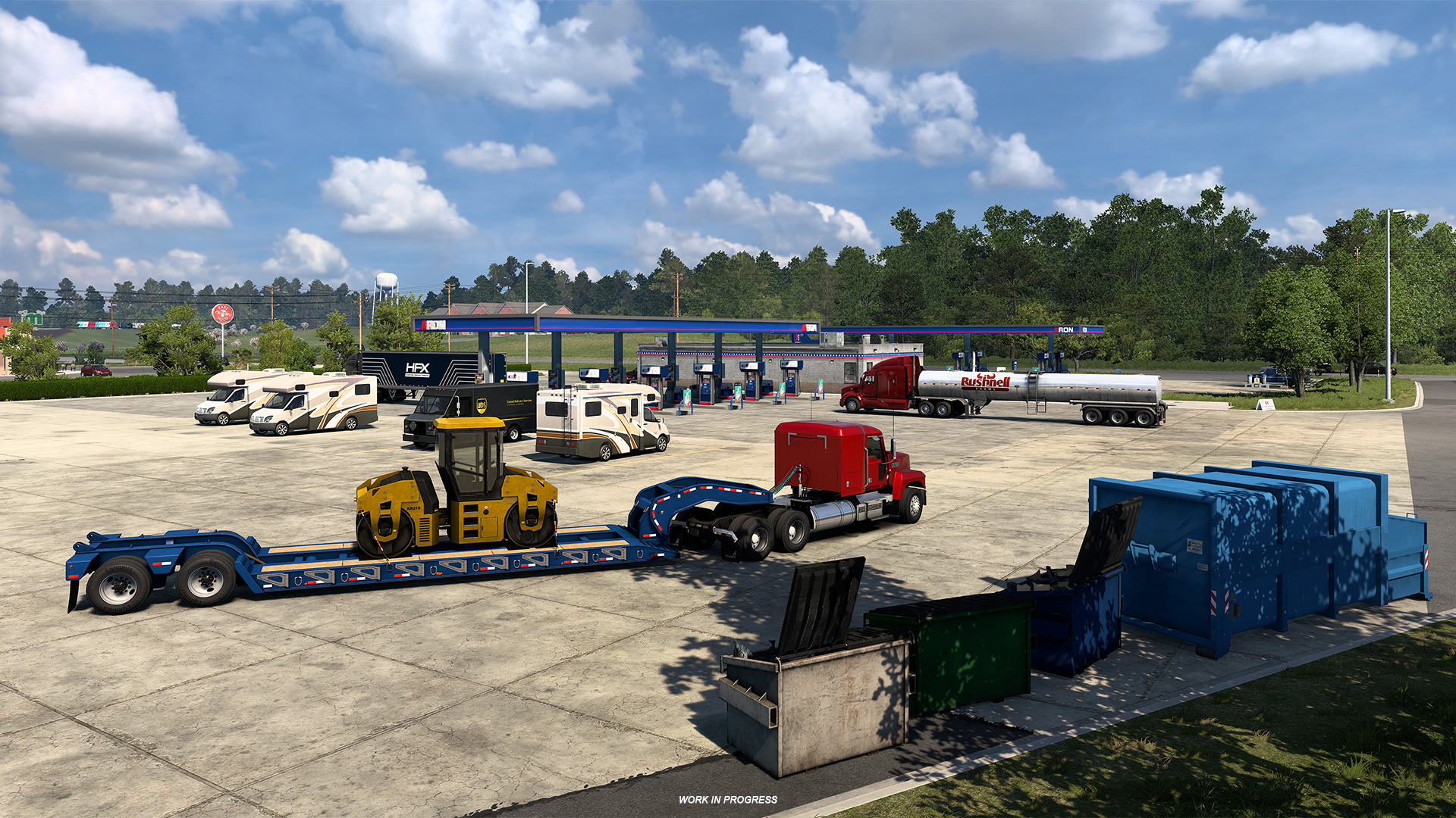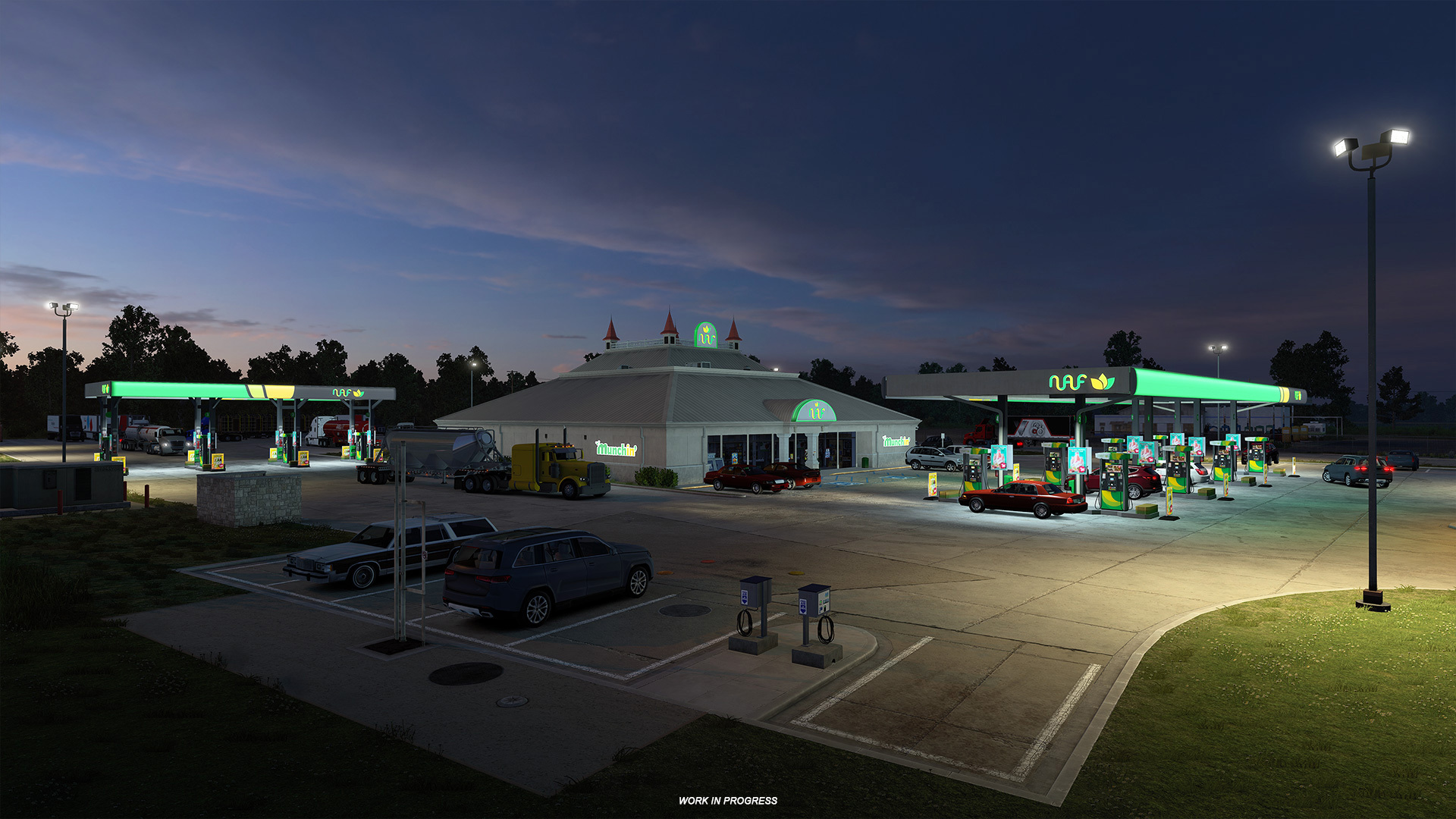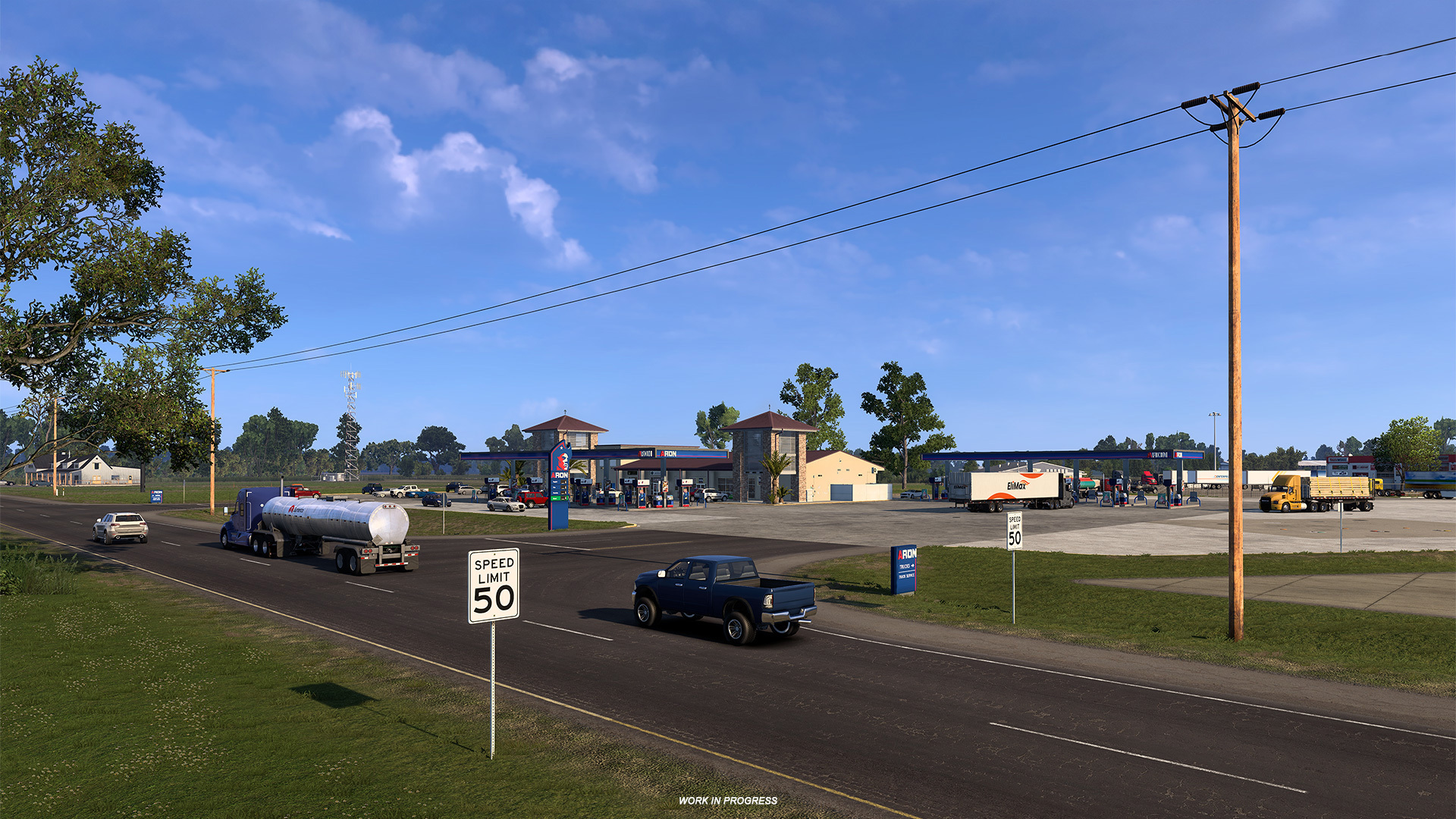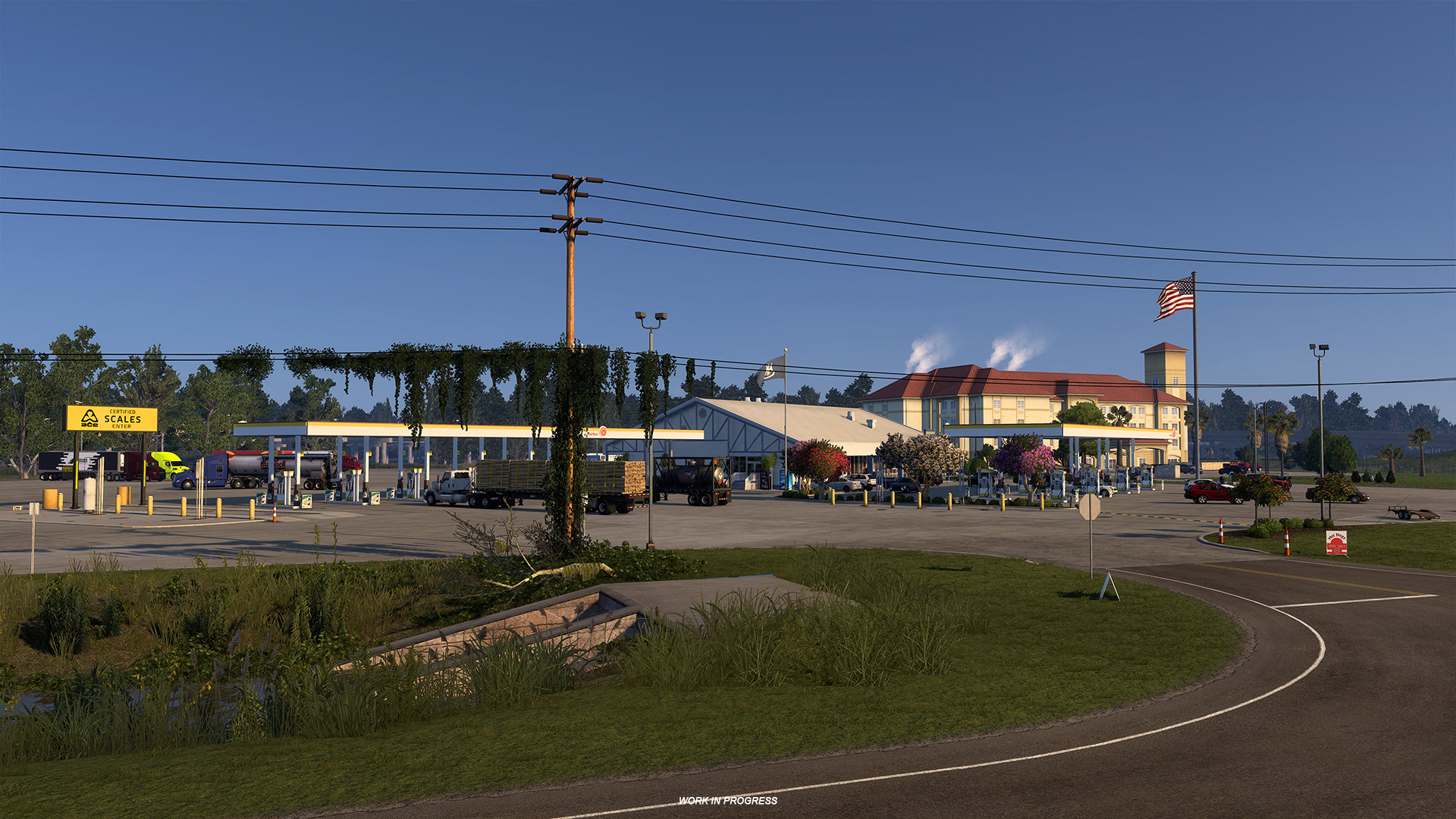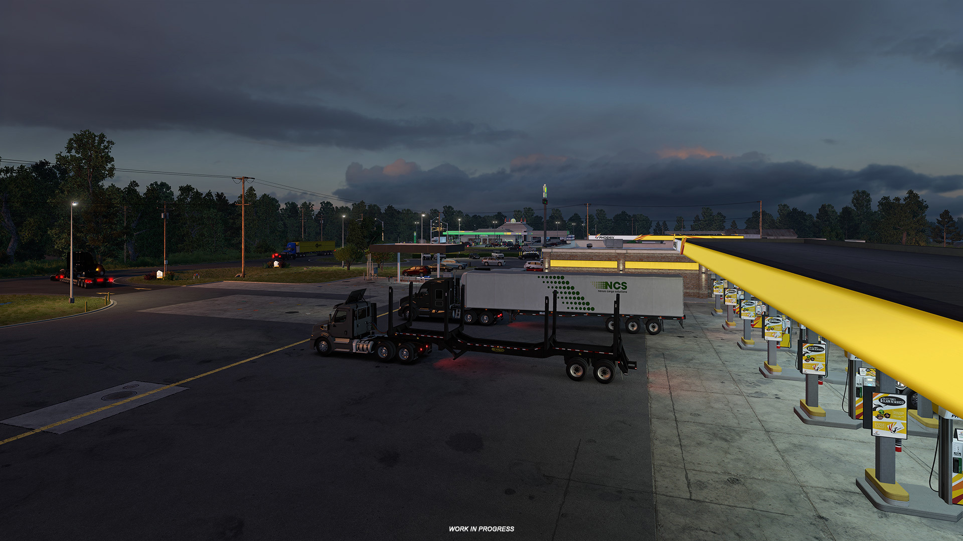 DLC 中有大量卡车停靠站,包括“为小镇路边停靠站提供充足停车位和多个燃油泵的大型综合体”。