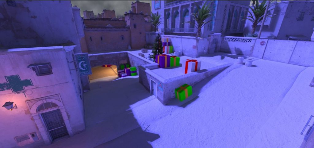 de_Mirage 圣诞版 | WINGMAN 是粉丝制作的 Mirage 圣诞节重新皮肤,专为 CS2 中的 2v2 Wingman 打造。在熟悉的幻影建筑之上呈现圣诞节视觉效果:雪、装饰品、圣诞老人道具等。