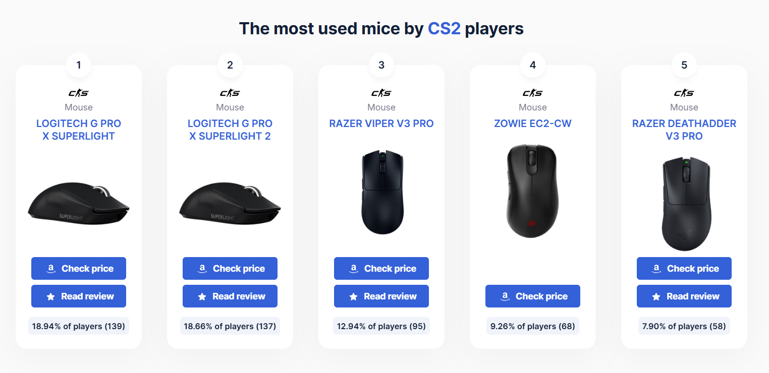 第二受欢迎的型号是Razer 死蝰蛇 V3 Pro, 哪个21%的脚轮一起玩。第三名是来自 Zowie 的传奇 EC2-CW (15%)。 EC线是13岁,这两个字母是缩写。埃米尔·克里斯滕森前职业选手,曾效力于CS 1.6的NiP并参与鼠标开发。