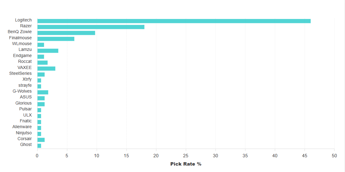 罗技、Razer、Vaxee 和 Zowie称霸职业舞台。其他受欢迎的鼠标制造商包括微软公司、戴尔科技公司、联想集团有限公司、华硕计算机公司、雷柏、Genius、Fnatic Gear Ltd.和HyperX。