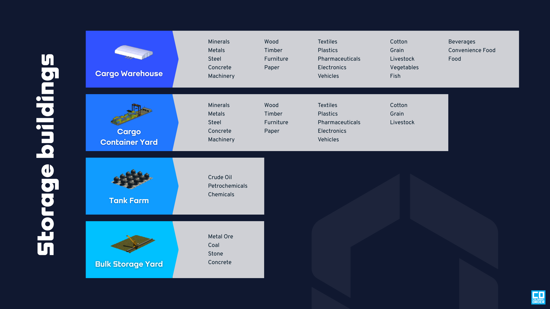 端口有三种尺寸:小端口、中端口和大端口。每种规模都有自己的成本、建筑占地面积、交通以及建筑升级和扩建。总共有 21 个子建筑、12 个仓储设施、两台货物起重机以及两个不同大小和功能的辅助门,当您运送更多货物时,这些门将会解锁。