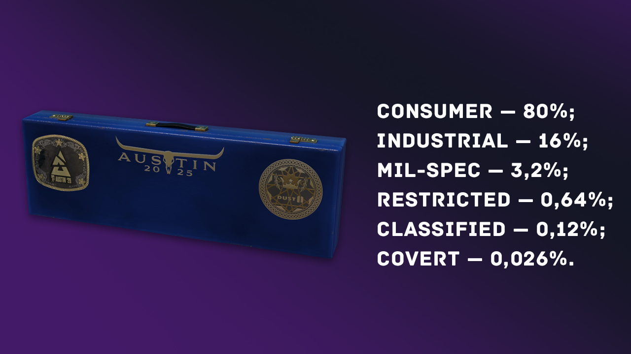 - 失败的机会— 绝大多数案件掉落物的市场价值较低,通常低于开箱成本。鉴于获得稀有物品的几率很低,每个空缺都有很高的损失风险。
