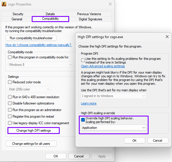 - 点击更改高 DPI 设置 → 覆盖高 DPI 缩放行为
