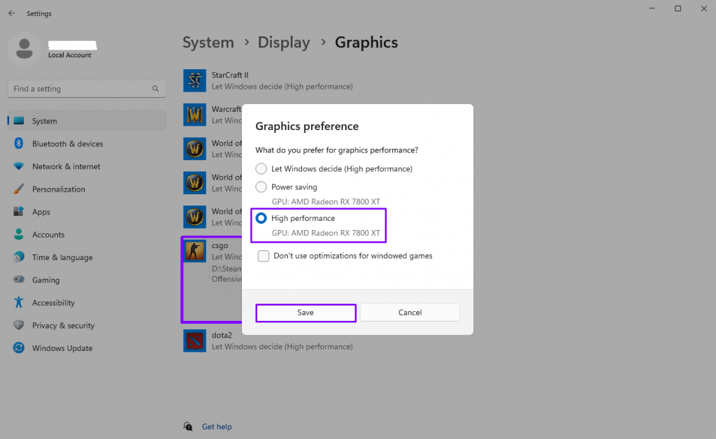这可确保 Windows 优先考虑 CS2 的 GPU。