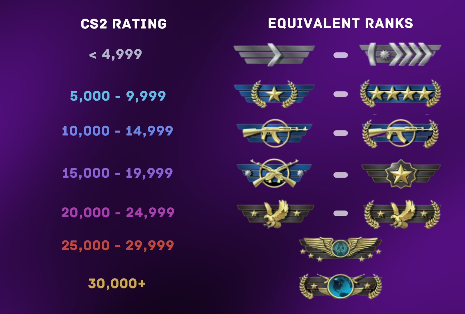 一般来说,竞技玩家可接受的评分在 5,000 到 9,999(蓝色)之间。 10,000 到 14,999(深蓝)以上的玩家被认为是优秀玩家。 20,000 及以上的评分在 CS2 中被认为是高水平,截至 1 月份,超过 90% 的玩家都获得了评分。