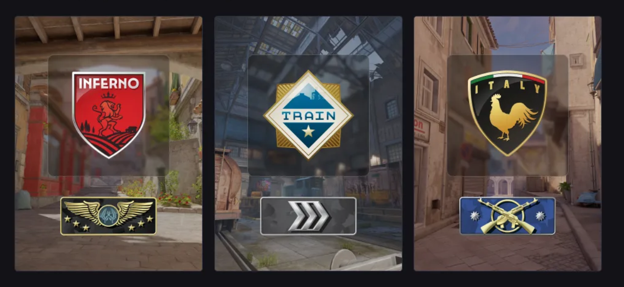 和竞技排名一样,高级模式中的 CS 评级与地图相关联。地图选择过程遵循电子竞技传统,团队禁止他们不想参加的地图。
