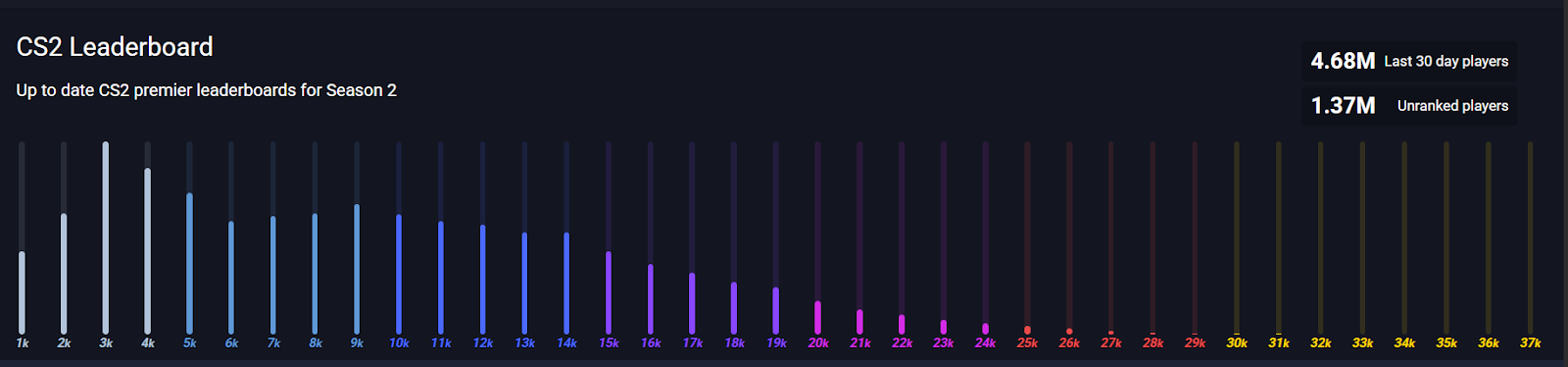 在《反恐精英 2》中,排名赛系统基于 ELO 分数,该分数决定了玩家的技能水平。查看每个级别的玩家百分比;我们从 csstats.gg 获取统计数据。我们认为这非常有趣。