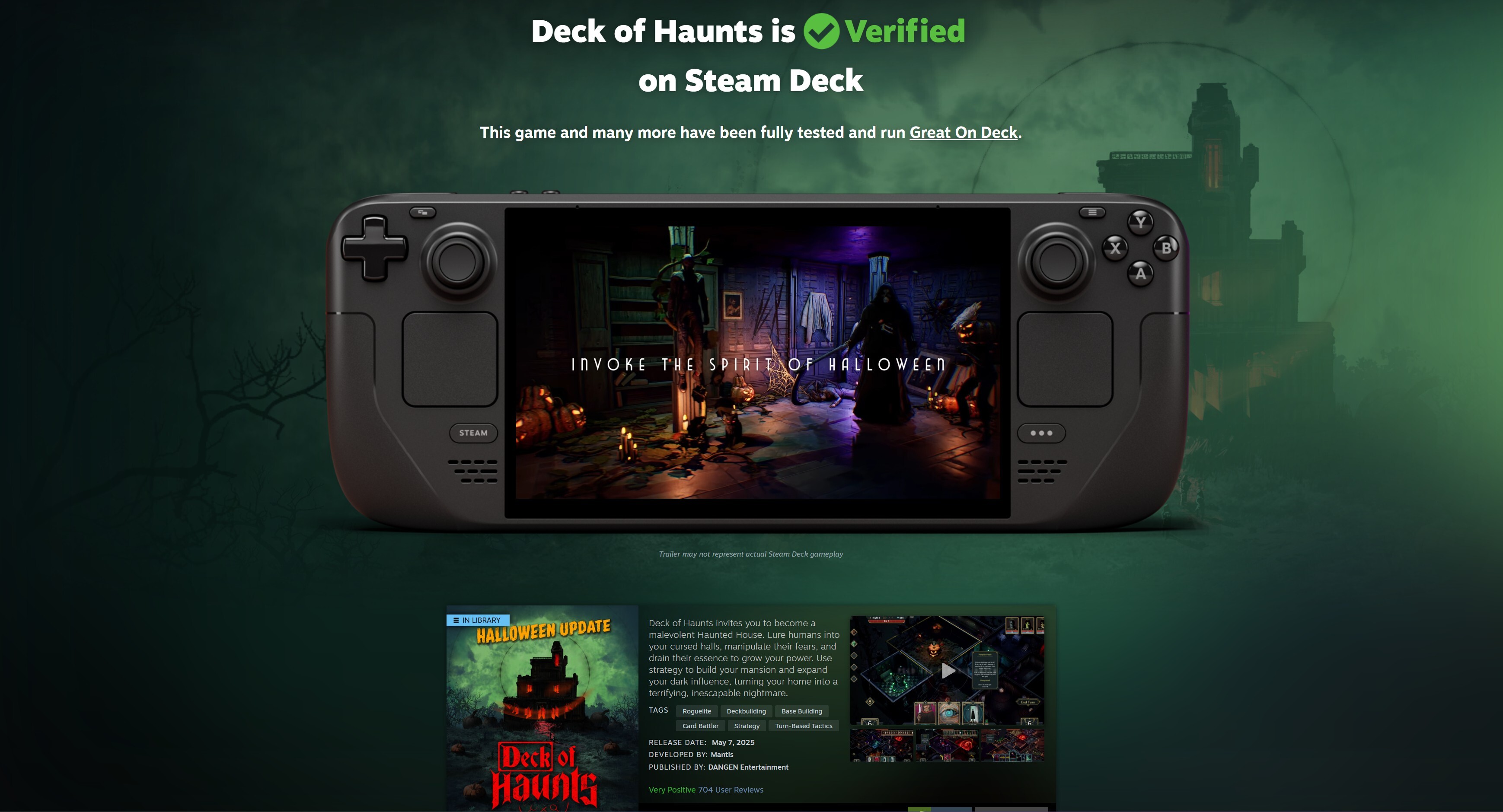 我之所以想到这款以鬼屋为主题的纸牌游戏,是因为我刚刚在 Steam 新闻源中读到了更新。正是在那里,我发现游戏刚刚被赋予了命运的绿色勾号,也称为 Steam Deck 验证。