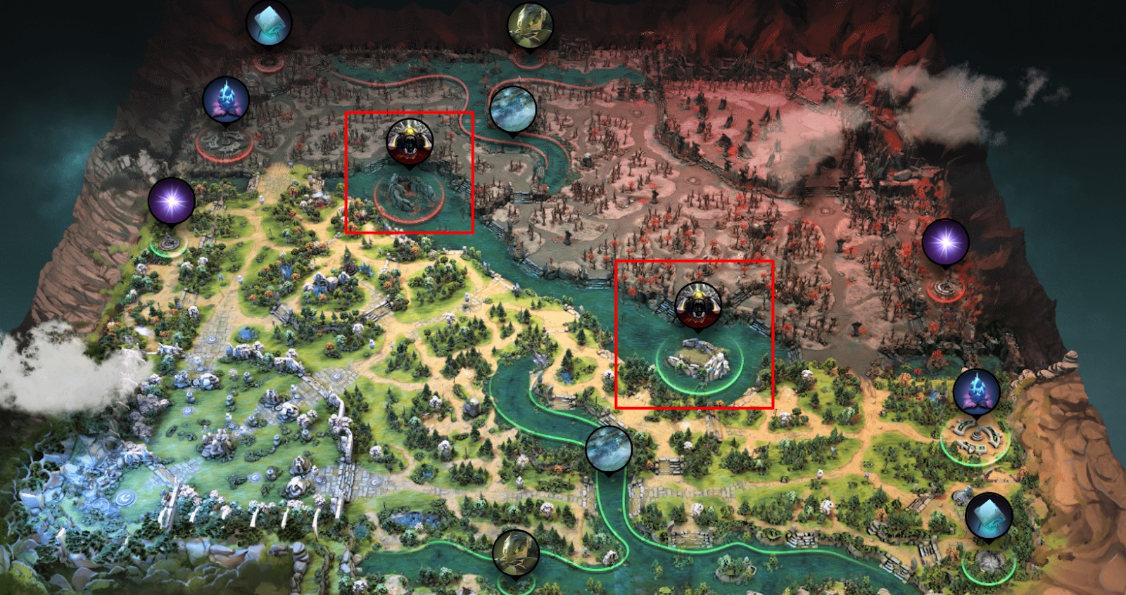 肉山现在有两个巢穴并在它们之间独立移动。期间天,他位于底部地图的位置,以及夜晚,他移动到顶部地图的。这个移动不是通过传送完成的;而是通过传送来完成的。相反,他穿过中间车道。如果有人阻挡他的道路,他就会扔掉该角色,这使得他的动作对于控制地图具有战略重要性。