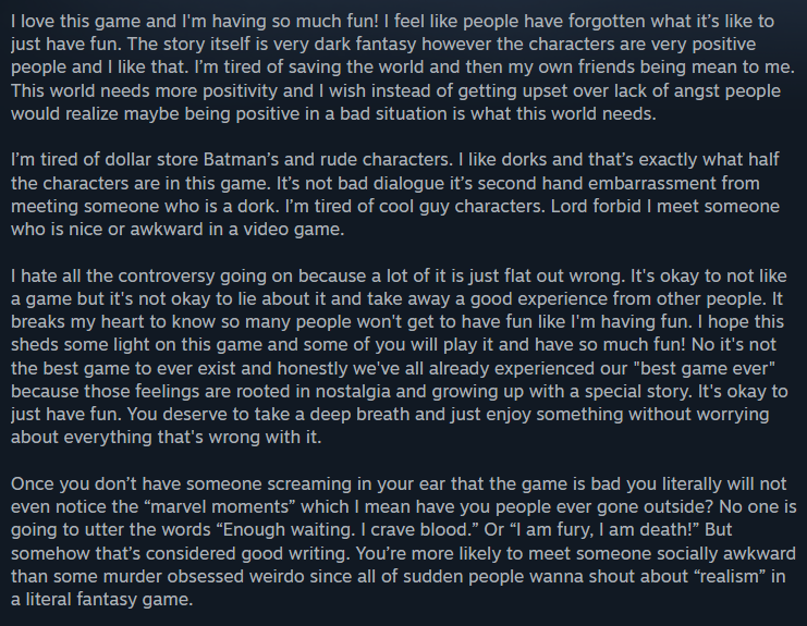 在 Metacritic 上,好的东西不是好的对话、优化和图形,但它们还不够。你可能会感到惊讶,但这款游戏也因为赞扬它的原因而受到批评。人物性格太善良了;世界太轻了,歧视和争斗都不存在。