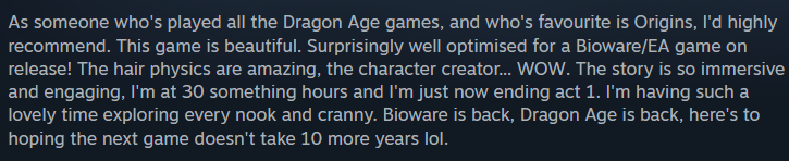 “好吧,首先我想说的是,我玩过并喜欢所有其他《龙腾世纪》游戏,我喜欢也不喜欢这款游戏,感觉他们花了大量的时间把它交给我们,它相当未经打磨,并且有一些相当令人不安的遭遇错误,比如当我试图在不同的角色之间挖掘时无法挖掘我的文件,或者删除我的角色孔外观并将其恢复到默认状态,迫使我一遍又一遍地重做游戏,我想如果他们这样做的话一些调整和更新他们确实可以扭转局面”。