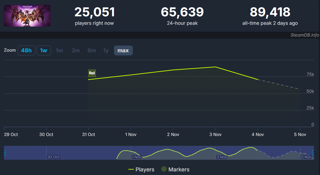 《龙腾世纪:面纱卫士》是一款高预算 RPG,但它未能达到 Steam 上许多中等预算游戏的水平。例如,7年前发布的《天国:拯救》和《神界:原罪2》吸引了超过发布时有 90,000 名并发玩家– 那时 Steam 还没有像今天这样大的平台。