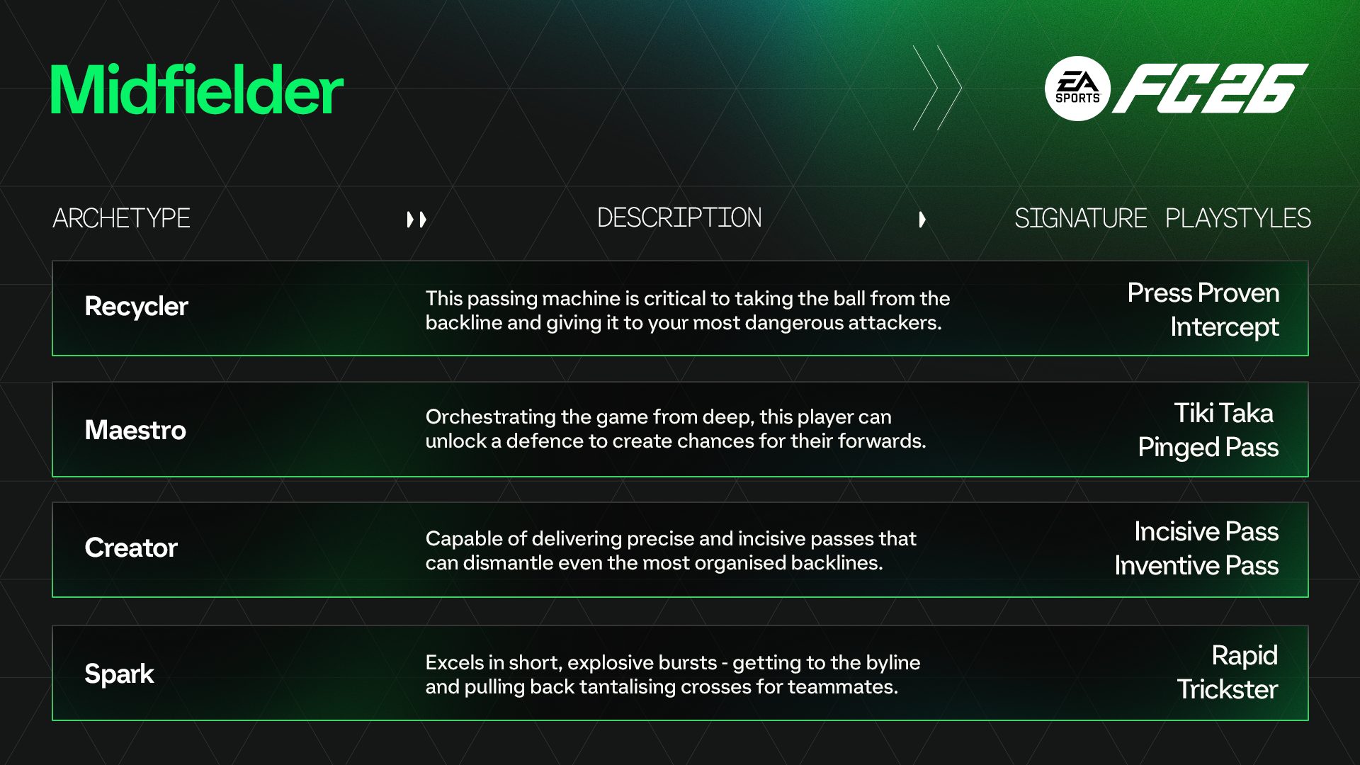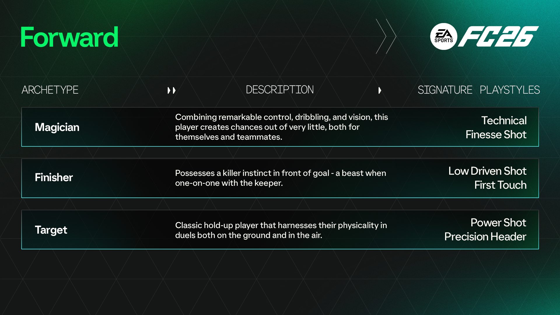 玩家原型在最后的游戏玩法揭示中被戏弄,它们将在你作为玩家和经理的职业生涯中发挥重要作用。该系统引入了 13 种原型,所有灵感均来自世界足球偶像,每一种都旨在为您提供适合您的比赛风格的选项,特别是由于称为“专业化”的子类别。