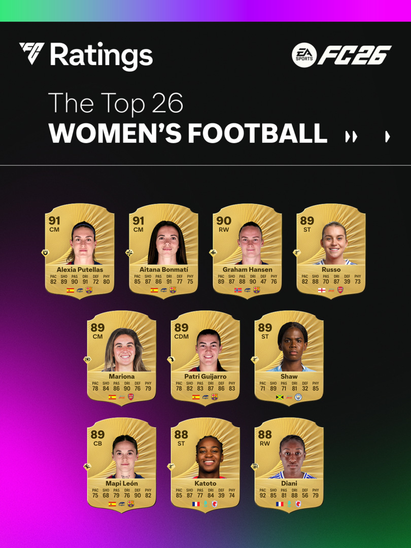 今天,Electronic Arts 公布了其热门足球模拟器 EA Sports FC 26 下一期的官方评分列表,其中收录了游戏中排名前 26 的男子和女子球员。