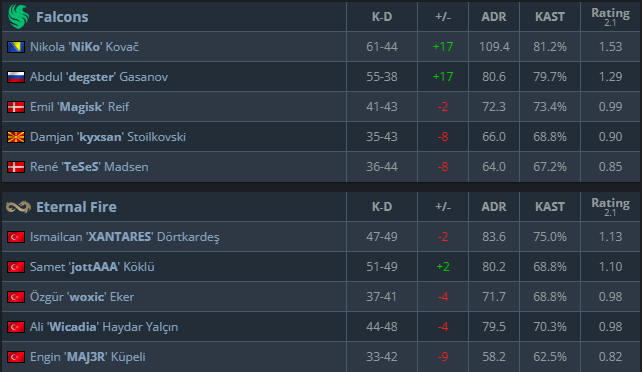 '尼科'和'德斯特'球队的明星球员和狙击手光芒四射,在积分榜上遥遥领先四分之一决赛匹配永恒之火不给对手任何机会,看来两人现在的状态都很好。'魔法'看起来状态不太好,并且'TeSeS'与他效力时的水平相比,他看起来完全失落了英勇。总的来说,很难判断这支球队的能力,因为没有距离可以判断。