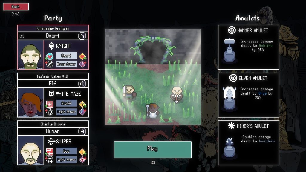 在任何跑步开始时,您都会看到一支由 3 名英雄组成的队伍。嗯,英雄相邻可能更准确。瞧,就像在《盗贼遗产》中一样,在《被遗忘的矿井》中,你的角色继承了令人愉快的无用特征。当我的一些弓箭手具有蹒跚特征时,我开始注意到这一点,这使得他们一次无法移动超过一块瓷砖。还有近视英雄,他们几乎看不到前方,从而降低了命中率,还有智力较低的白痴。你明白了。虽然你可以在开始之前切换任何英雄的种族(人类升级更快,精灵更擅长魔法,矮人很强壮)和职业,但这并不会消除他们的特质。这有点烦人,因为这意味着你必须在整个运行过程中处理随机障碍。