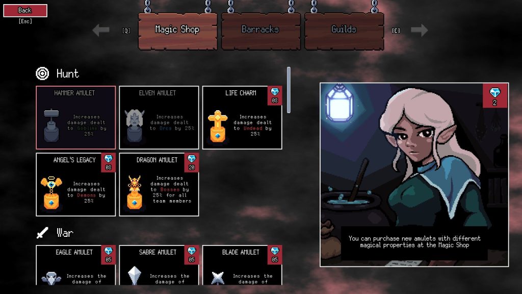 除了魔法商店之外,还有一个军营,您可以在那里购买新课程。但也许最重要的是行会。在这里,您可以花费宝石来解锁王国硬币,您可以将其投资于各个公会以提高其等级。这会增加你获得的经验值,增加魔法伤害的类型,最重要的是,在战斗后治愈你的团队。这非常重要,因为否则,你根本无法治愈(除了施放法术之外),并且如果团队成员死亡,他们通常会保持这种状态。当我第一次穿过矿井的翠绿大厅部分时,我只带着我的弓箭手。这么说吧,他在下一节中没能坚持多久。