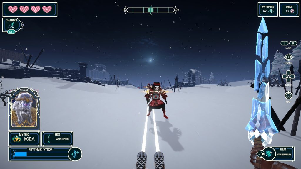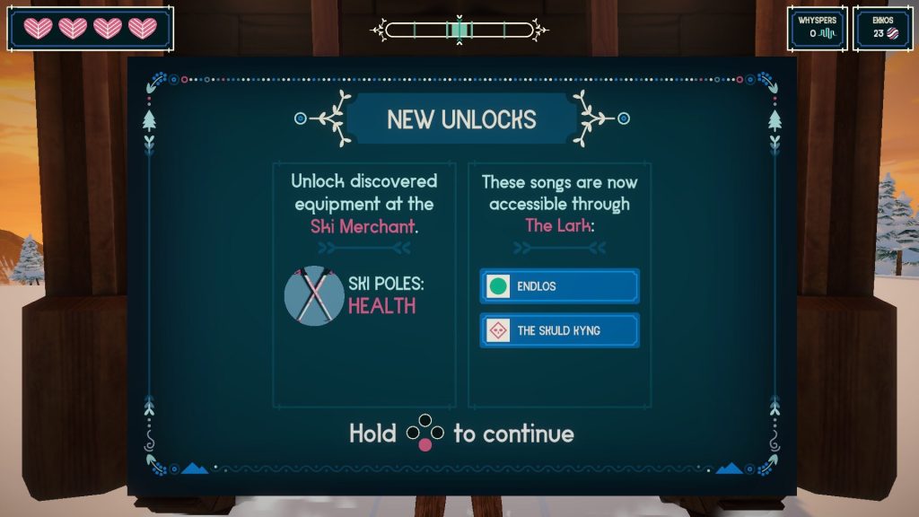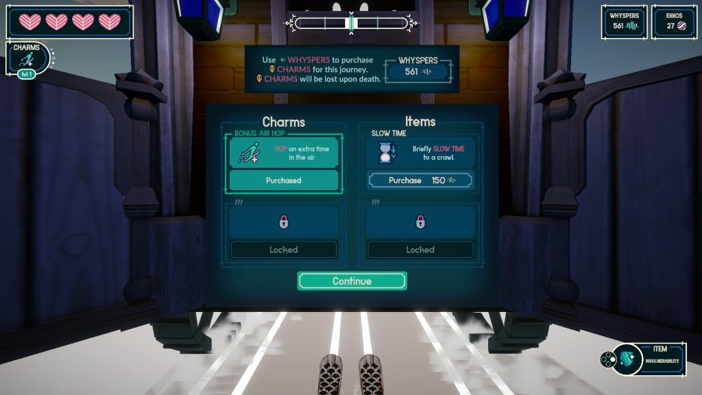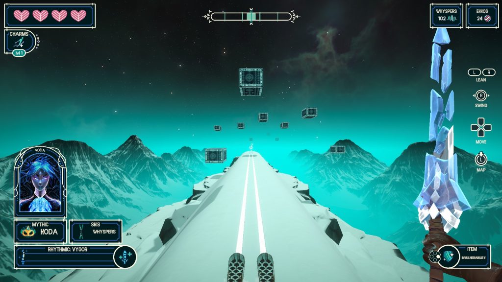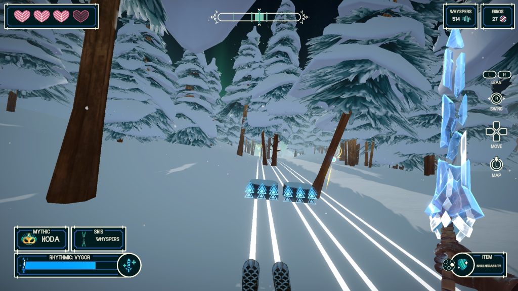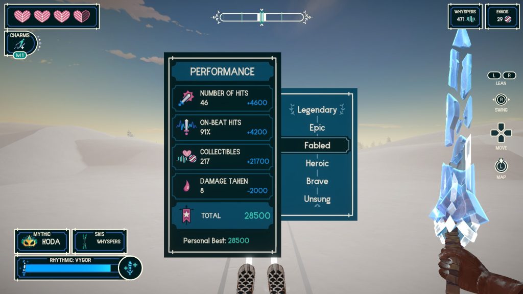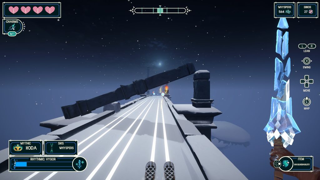 你看,除了通过移动来避免伤害之外,你还需要这样做来收集像 Whyspers 和 Ekkos 这样的资源。前者用于从商人那里购买临时装备和物品,例如增加你的生命值或提供暂时的无敌能力。后者用于解锁您可以交换的新装备,以及您之前演奏过的故事歌曲以供练习。如果你设法按照节奏玩关卡并收集称为 Resyn 的资源,你就会填满你的节奏条,它可以用来治疗你。