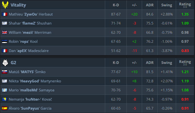 重神已经是领先者MVP由于他在比赛早期的出色表现,甚至在总决赛之前就获得了荣誉,尤其是对阵法泽,愤怒, 和精神。通过局域网,他发布了团队领先的1.25 评分,有一个局域网对战评分 1.32,仅以微弱优势黯然失色活力的ZywOo并被队友紧紧尾随将会看到。