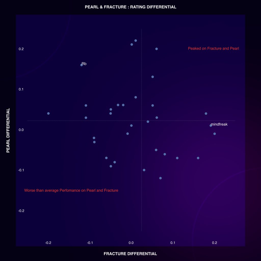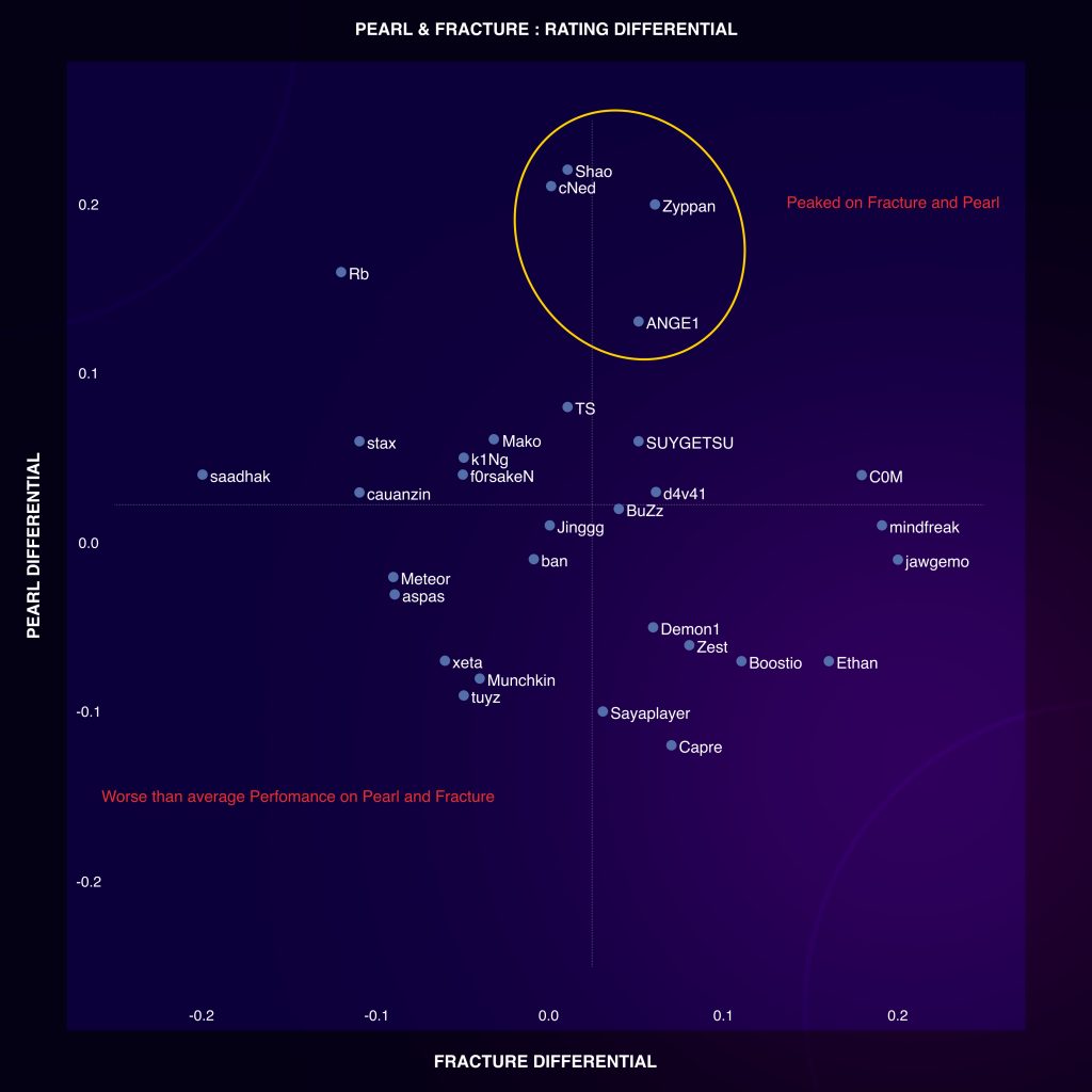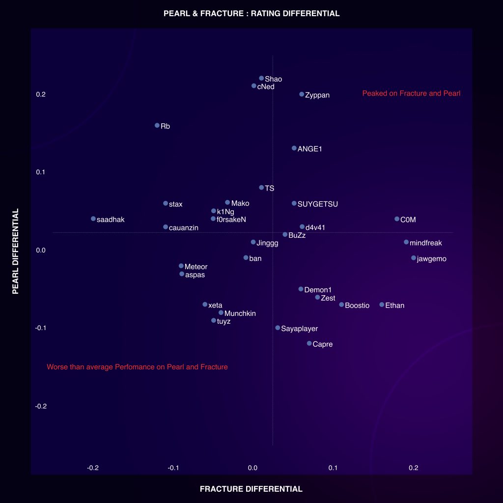 最后让我们来看看在这张地图上真正达到顶峰的玩家,超越了同龄人。只要看一眼图表,您就可以说颌骨宝石(+0.20) 和邵(+0.23) 分别是在 Fracture 和 Pearl 上达到最高峰值的玩家。然而,事实远非如此。