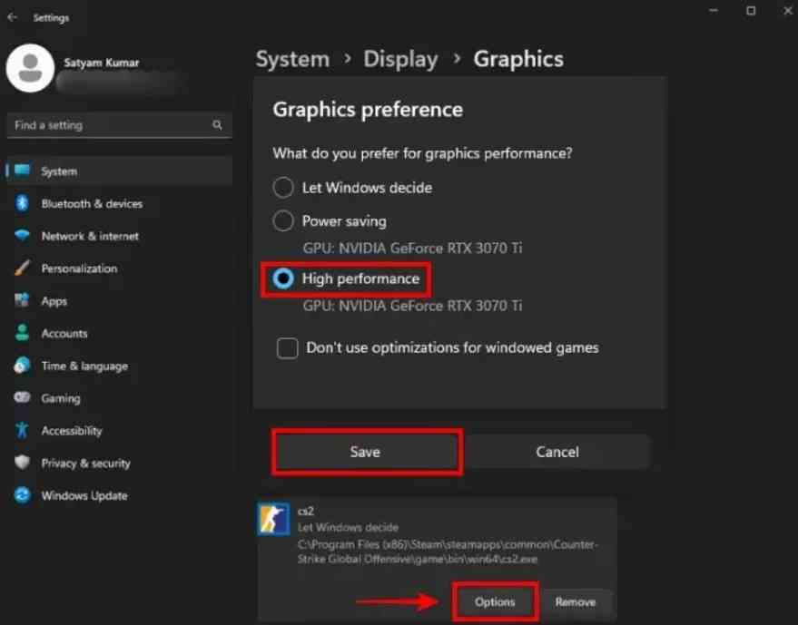 - 点击 ”选项”旁边的 CS2.exe 然后设置你的图形处理器(显卡)至“高性能“ 模式。