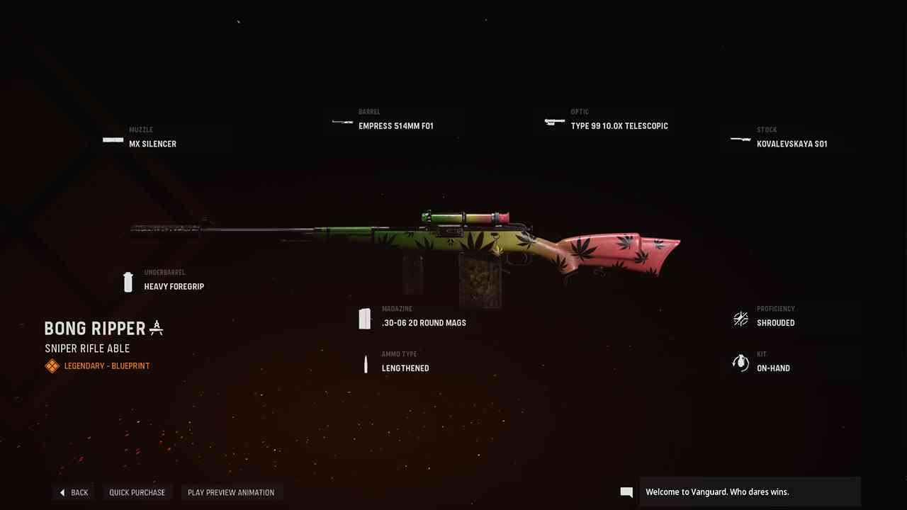 拉斯塔狙击步枪蓝图,带有类似烟枪的瞄准镜,枪管周围有大麻叶。