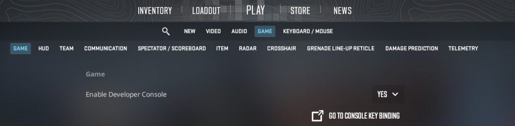 在游戏中,打开您的设置,转到“游戏,“找到选项”启用开发者控制台,”并把“是的”如上图所示。打开控制台的默认热键是“~”,您可以通过单击“进行更改转到控制台按键绑定”。