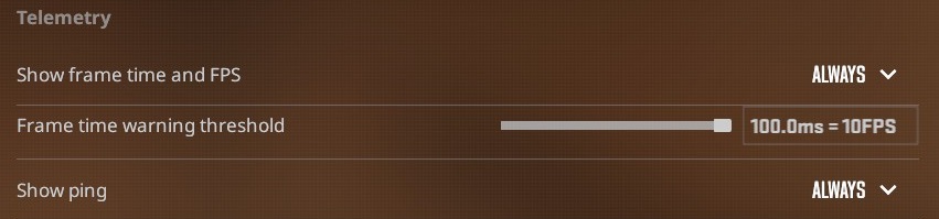要打开CS2 FPS 计数器,您需要进入游戏设置,找到遥测,然后将“显示帧时间和 FPS”放在“始终”选项上,如上面的屏幕截图所示。您也可以使用“显示 ping”执行相同的操作,这样您就可以看到您正在玩的服务器的 ping。