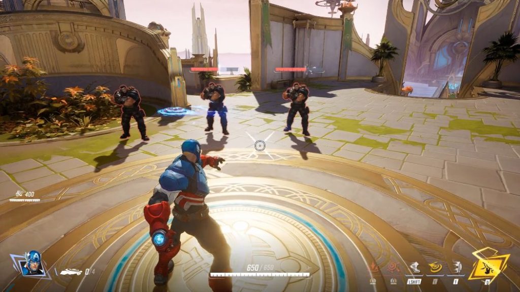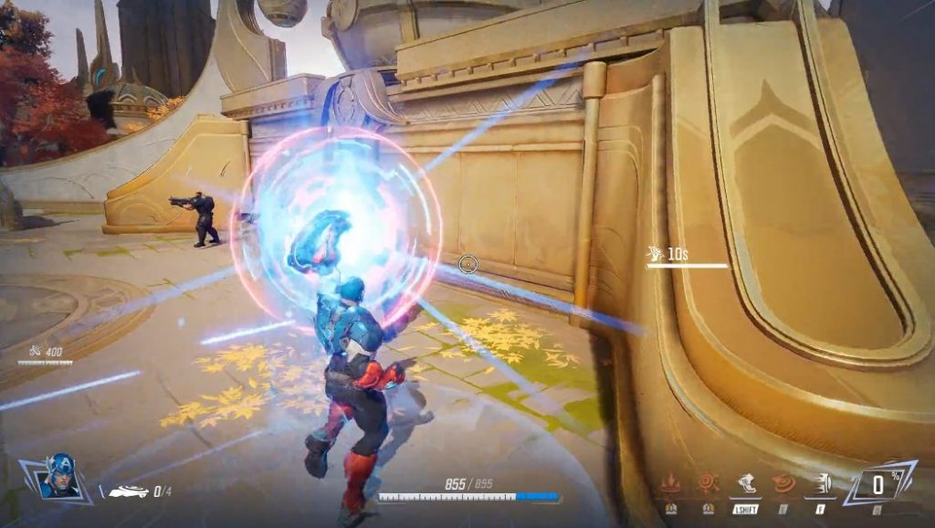 队长发射盾牌,对第一个击中的敌人造成伤害。与对手碰撞后,护盾会弹向附近的其他敌方英雄,对他们造成的伤害减少。如果美国队长第一次投掷没有击中任何东西,盾牌仍然会弹跳。
