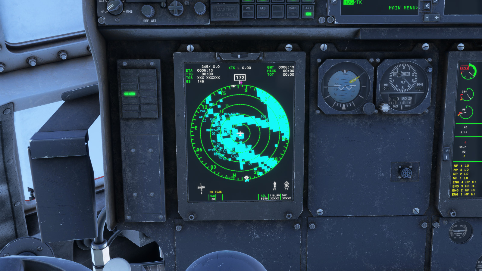 - 高度复杂的雷达系统,包括带有地形阴影,横梁宽度和倾斜,偏移,扩展,冻结等的地面映射,以及空对空(皮肤油漆)和天气模式