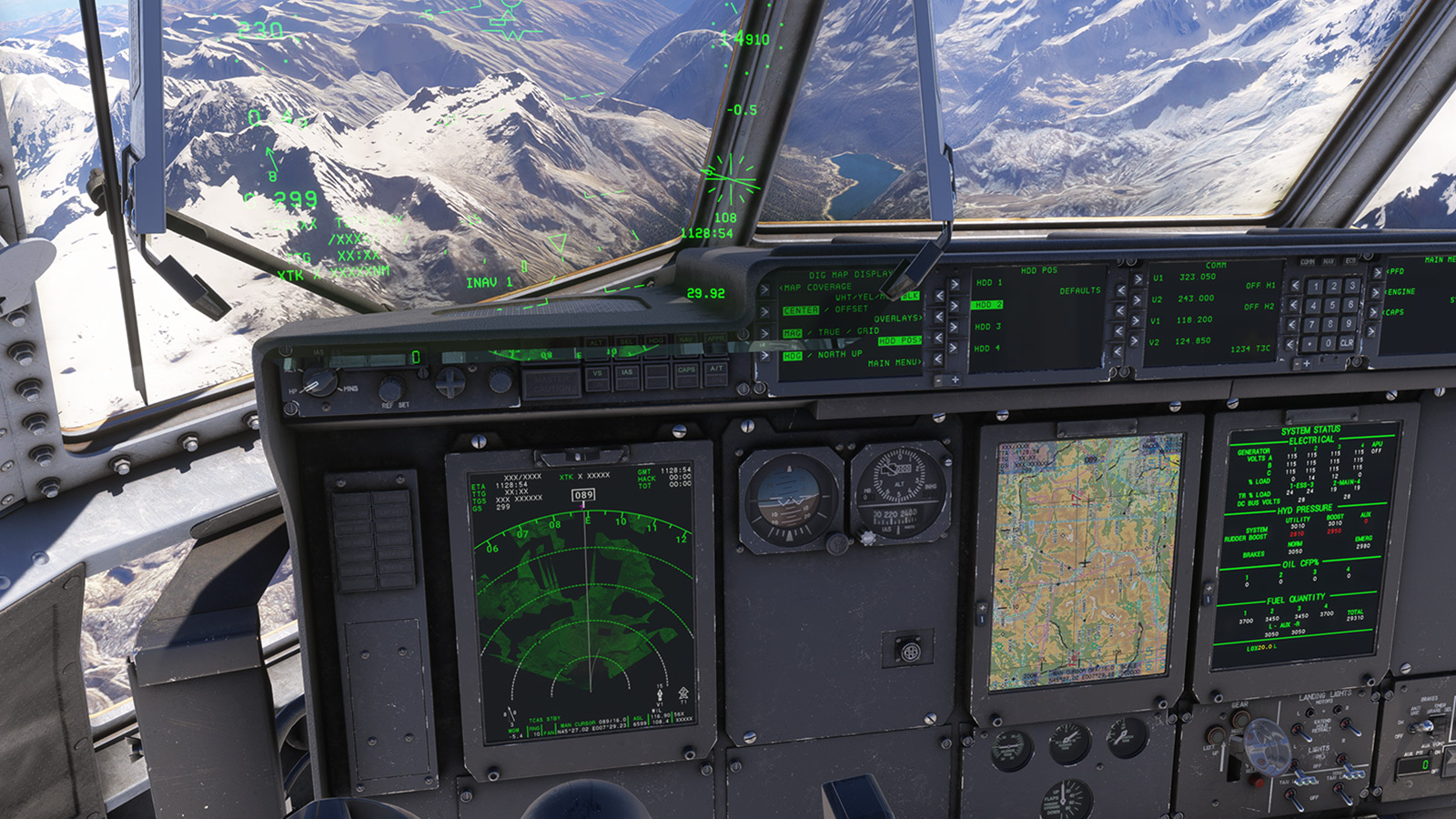 - 高度复杂的雷达系统,包括带有地形阴影、波束宽度和倾斜、偏移、扩展、冻结等的地面测绘,以及空对空(皮肤涂料)和天气模式
