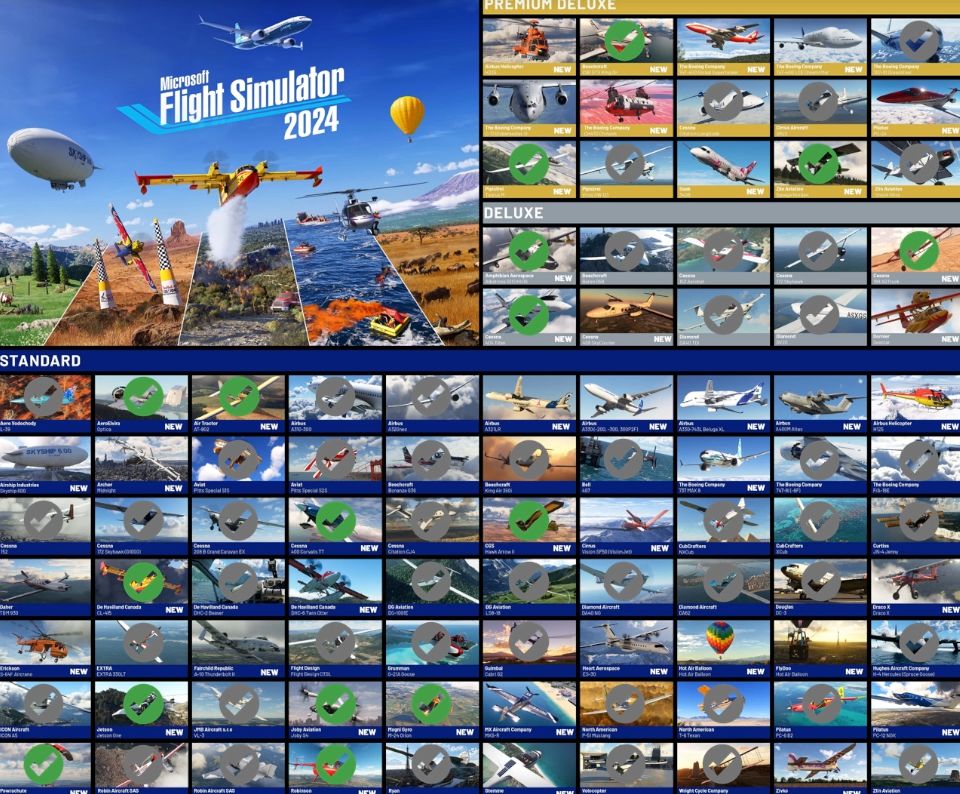 最重要的是,下面我们看到 MSFS 2024 中包含的飞机。没有复选标记的飞机是目前未包含在 MSFS 2020 中的飞机。微软将尝试在 2020 年移植尽可能多的应用程序,尽管这不可能对所有人都适用。