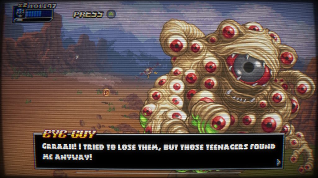 虽然我确实觉得这款游戏忠实于原作系列并且充满乐趣,但还是有一些失误阻碍了它获得我渴望给出的完美分数。其中之一是一些超级缩放器级别结果是多么令人沮丧。尽管它们在视觉上清晰且引人注目,但它们也非常长并且缺乏足够的检查点。在《Normal》游戏中,我在第 3 集中开始在超级缩放器关卡中碰壁,这就是我使用前两个继续的地方。这是由于从移动平台上摔下来太多次、被小老板殴打以及在与“眼睛家伙”的对抗之前失去动力而造成的。