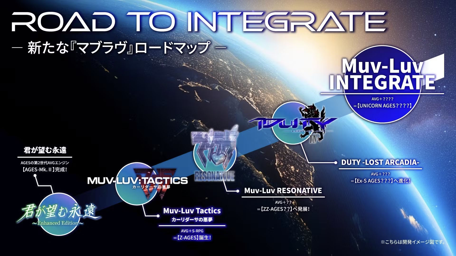预计在未来的某个时候,《使命:失落的阿卡迪亚》将以欧洲战线为背景,最后推出《Muv-Luv Integrate》,这是《另类》的成熟续作。