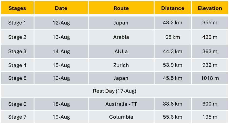 这2025 年 MyWhoosh 锦标赛将包括 8 月 12 日至 8 月 19 日在自行车模拟器中进行的 7 天比赛(以及 1 个休息日)。它将覆盖数百公里的距离和数千米的海拔增益。这些赛段将包括一系列路线,包括平坦、丘陵和山区的路线,以及计时赛段。
