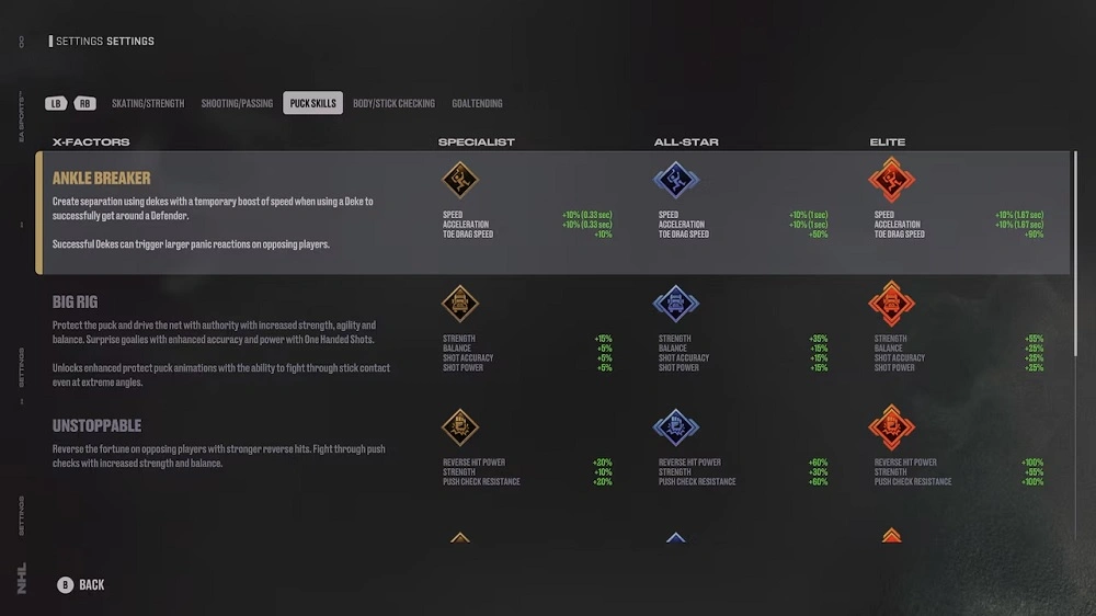 NHL 26 游戏演示的最后焦点集中在 X-Factors 2.0。 NHL 26 中有 5 个类别的 28 个经过改进和增强的 X 因素。每一个都包含取决于焦点的独特动画。开发者还改变了它们的标签方式,使其在游戏中玩时更清晰可见。 X 因素分为三个强度级别。每一种都为您在团队中如何利用它们以及如何与它们对抗添加了战略游戏玩法。