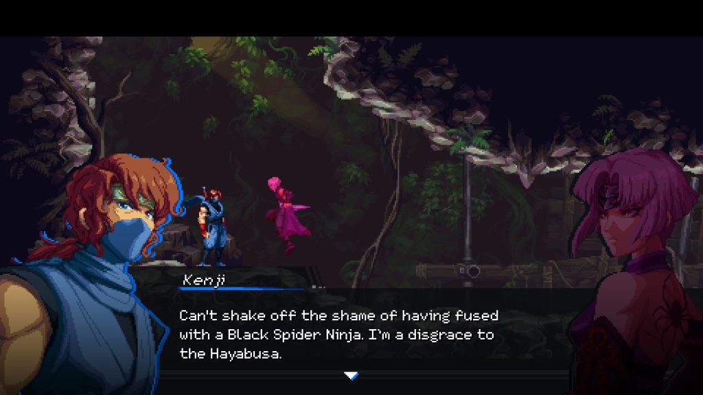 我玩的《Ragebound》演示版精选了一系列关卡,以提供最终体验的可靠描述。第一关和第二关之间也有不少叙事跳跃,健二突然发现自己被黑蜘蛛氏族忍者久森束缚住了。但这没关系,它给了我们一些期待。