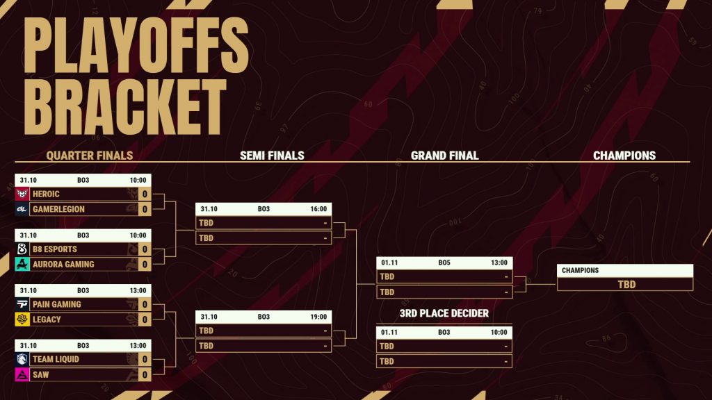 - 半决赛#1(获胜者英勇与玩家军团对阵获胜者B8与极光)开始于欧洲中部时间 16:00