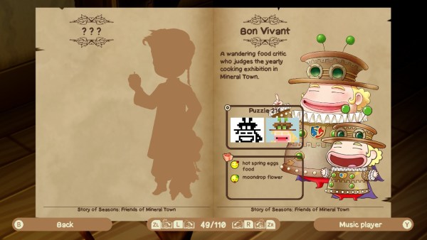 虽然游戏相关的故事非常轻松,但游戏制作者在角色发展上投入了大量精力。他们创造了一个包含来自几个不同城镇的一百多个角色的世界。在“年鉴”中,玩家可以阅读每个角色的简短传记,其中包括他们的好恶。当您解决谜题时,您可以解锁这本令人印象深刻的小册子的更多页面。