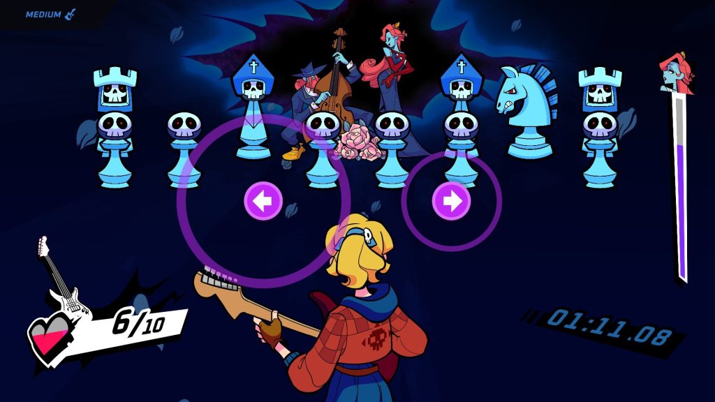 普通的老式骷髅只需按一下按钮即可摧毁,但也有其他骷髅会失去理智并继续跳舞。或者选择不同颜色的史莱姆,需要额外按一下按钮才能将其粘住,或者选择朝它们所面对的方向飞行的蝙蝠。然后是有弹性的巨龙,这是这个游戏的保持音符的例子。