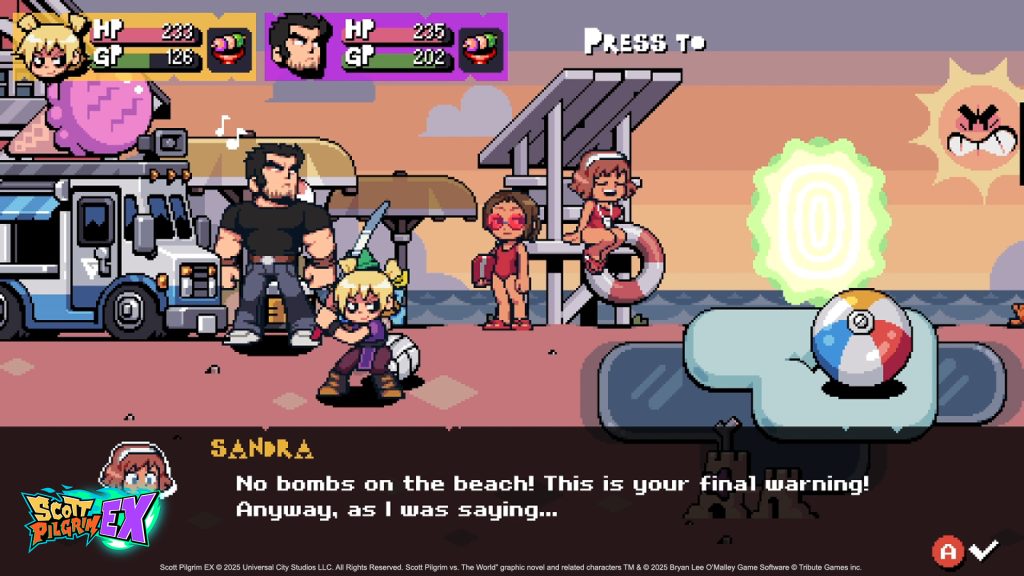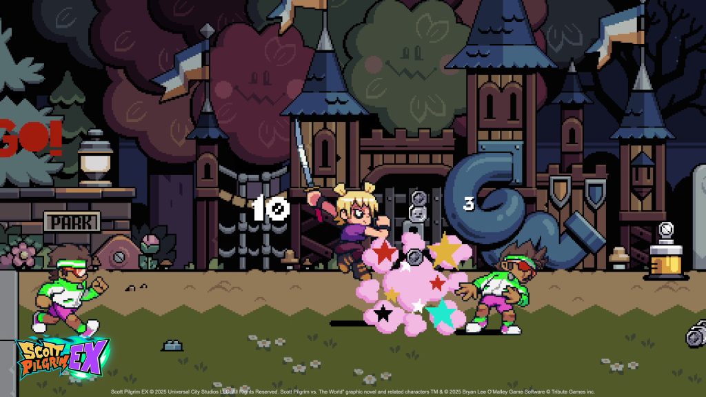 加入 Scott Pilgrim EX 对抗占领多伦多的帮派的还有该系列标志性的《邪恶前任联盟》中的两名前敌人:大斗士卢卡斯·李和小恐怖分子罗克西·里克特,两人都以 Tribute Games 闻名的高品质复古艺术风格装扮。卢卡斯暂时摆脱了好莱坞明星的身份,凭借格斗技巧和全武器化的滑板(这意味着他会用它击中人),向任何挡在他面前的坏人发起攻击。与此同时,罗克西将她标志性的剑切和切丁带入战斗,成为一名快速出击的半忍者,她的装备包括烟雾弹和动作,使她成为战场上的搅拌机。