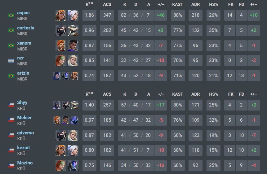 比布尔的表现反对KRÜ电子竞技他们的进攻和防守之间表现出明显的差异。在绑定MIBR的表现很挣扎,尤其是在进攻上,只赢了几轮。他们的防守稍好一些,但仍不足以保住地图。在分裂,MIBR看起来很强大,凭借扎实的进攻表现和不错的防守,结束了地图。深渊这是他们最平衡的表现,稳定的防守帮助他们保持了控制并赢得了地图。总体而言,MIBR 的优势在于他们的防守设置,但改善他们的进攻可以使他们成为一支更加多才多艺的球队。