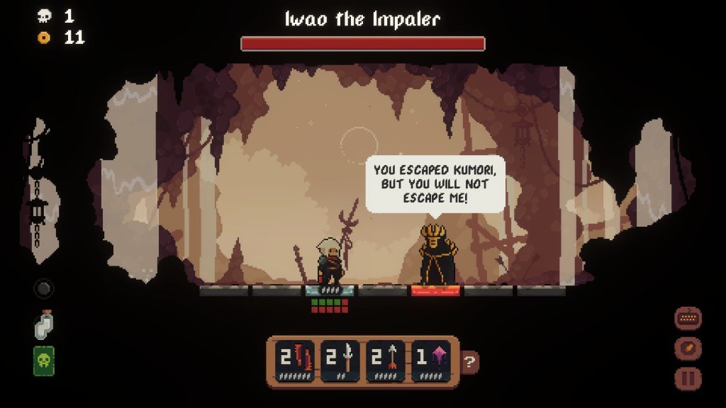 虽然我玩过很多回合制游戏,但这款不同。当你执行特定操作时,回合就会过去 - 使用 A 和 D 按钮向左或向右移动,使用 W 转身,向你的攻击队列添加一个图块或使用空格键攻击。方块代表各种武器,例如手里剑、矛或剑,甚至是咒骂敌人等技能,使他们在下次攻击中受到双倍伤害。虽然将它们放入攻击队列中确实可以进行回合传递,但将它们从队列中删除或重新排列它们的顺序则不会,这是游戏如何运作的关键。