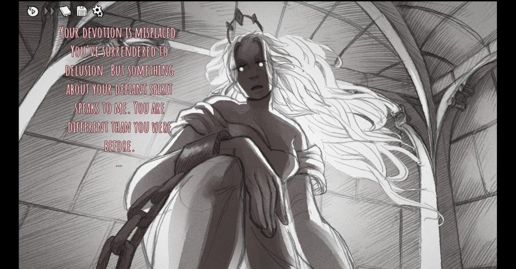 至于声音设计,这也很棒。音乐时而忧郁,时而神秘,甚至偶尔令人振奋。而且配音真的很令人愉快。我喜欢公主本人的系列,它可以从活泼可爱到完全可怕和险恶。英雄的各种心灵碎片也很有趣,尽管我最喜欢的是 Smitten,它听起来很像《What We Do In The Shadows》中的吸血鬼 Laszlo。当艺术作品和精湛的音频设计结合在一起时,您就拥有了如何制作视觉小说的杰作。