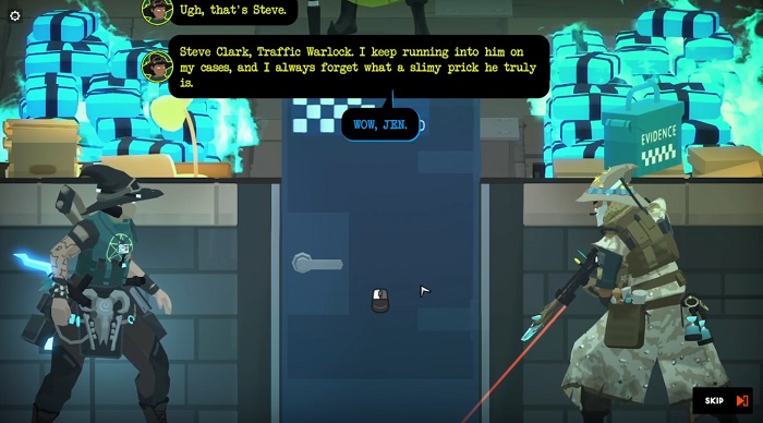 教程结束后,剧情跳转到六个月后的下一个主角,Jen,一名独立的 PI 女巫,偶然发现一名医生向一名德鲁伊黑手党执法者开枪,而这名执法者是唯一有能力向 Jen 的调查工作支付报酬的人。当然,当地警察不太喜欢她插手他们的生意,在受到严厉斥责后,她试图离开,结果发现整个警察局都着火了。原来他们正在遭到突袭,而策划这场混乱的人不是别人,正是丽芙。除此之外,事实证明赞就在隔壁房间,小毛们认为他是突袭队的一员,但没有人相信他是无辜的。几次破窗之后,珍和赞现在组成了一支队伍,对抗整个警察部门,同时弄清楚到底发生了什么。情节从这里开始变得更加复杂,将大量的毒品、火灾和一大堆恶作剧和聪明的胡言乱语拼凑在一起。我不会剧透其他任何东西,但我会诚实地说,角色和世界让我着迷。