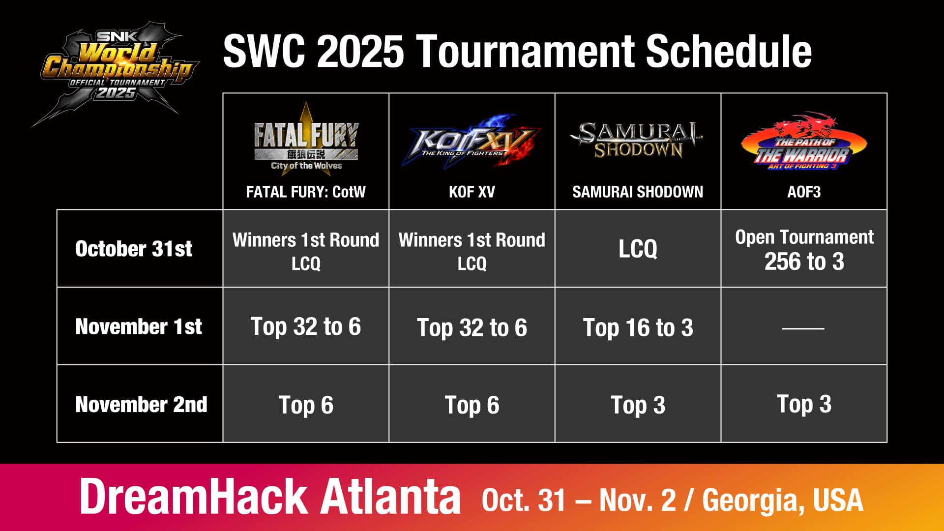 锦标赛将包括《饿狼传说:狼之城》、《拳皇 XV》、《武士对决》和《格斗艺术 3》。比赛将于 2025 年 10 月 31 日至 2025 年 11 月 2 日在 DreamHack 举行。