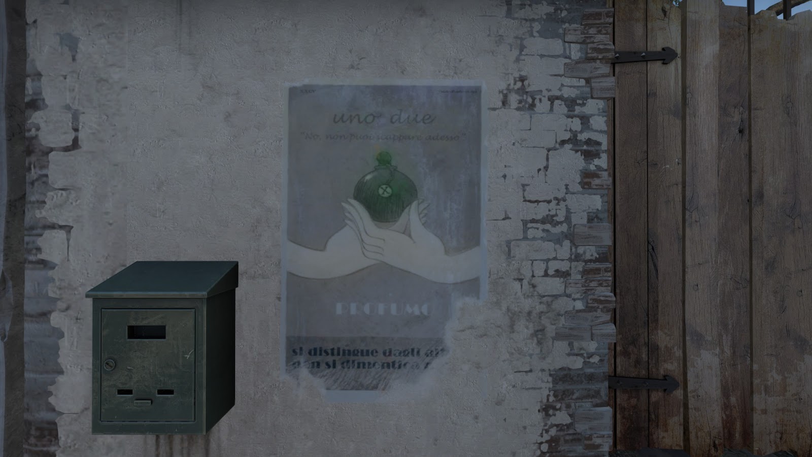 阀门在拐角处的砖砌建筑上贴了一张海报,类似于手榴弹形状的瓶子里装有香水的模仿广告,加上一句意大利语的座右铭,翻译过来就是“不,你现在无法逃脱。”
