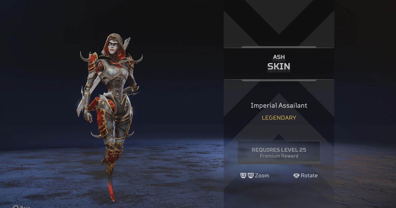 这是皇室中的高级皮肤红色和灰色颜色。穿上这款皮肤的阿什看起来已经准备好作为君主的私人刺客进行杀人——或者也许她就是君主本人。帝国攻击者传奇级皮肤包含在日蚀第 15 赛季:日蚀战斗通行证中。