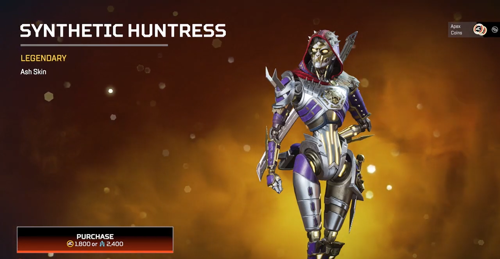 皮肤采用银色、紫色和金色配色,红色装饰和金色霓虹元素。它给灰烬字面上的獠牙并在胸甲上搭配狮子咆哮的徽章。皮肤还带回家猎人主题在她的肩膀上和其他盔甲部分下面添加一些毛皮。