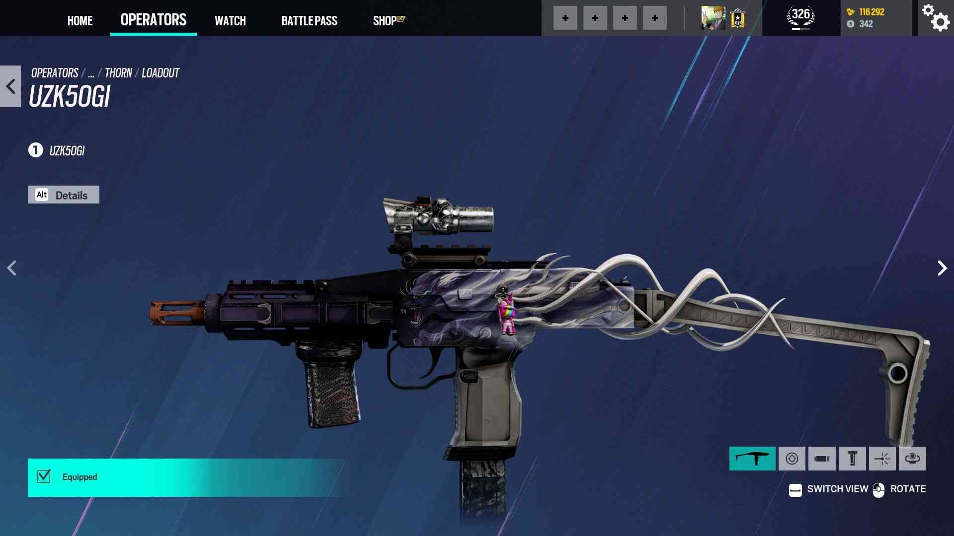 Thorn 的 UZK50GI 以其高射速和中等伤害而脱颖而出。它对于侵略性的游戏风格和漫游特别有效,使索恩能够快速与对手交战并消灭对手。